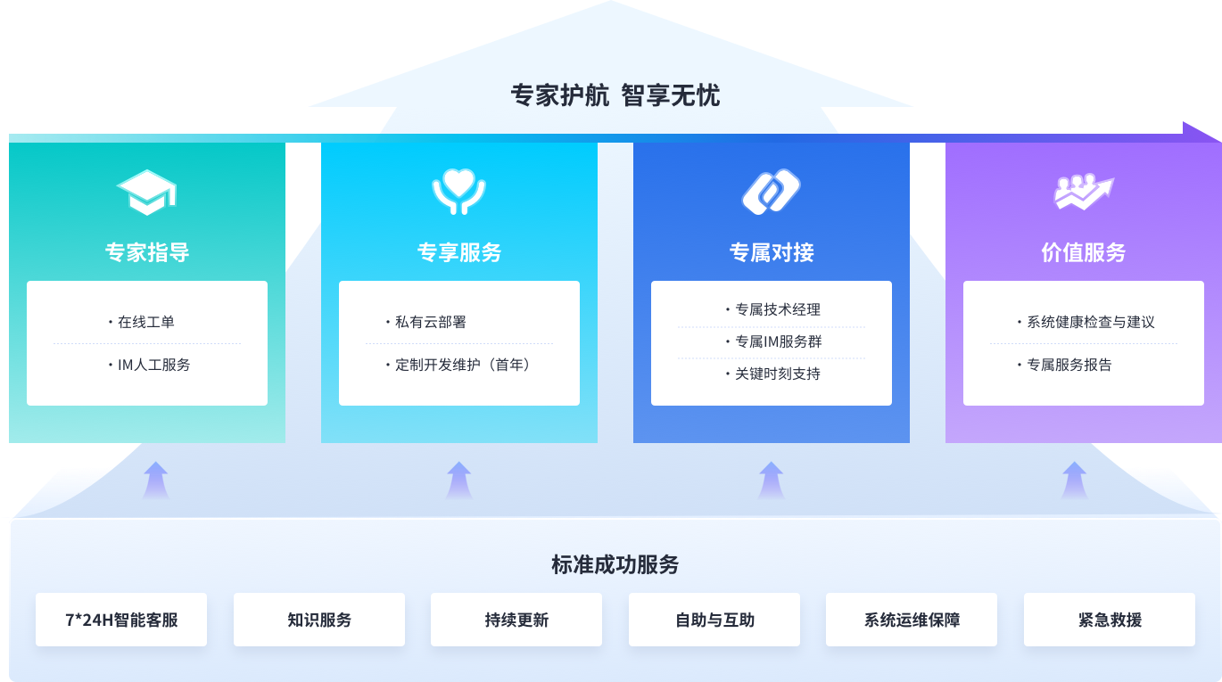 高级成功服务在标准成功服务的基础上,提供在线工单、IM人工支持、专属技术经理、关键时刻支持及专属服务报告等深度服务 通过多种人工服务方式,确保产品高效稳定运行,助力企业业务实现飞速发展。