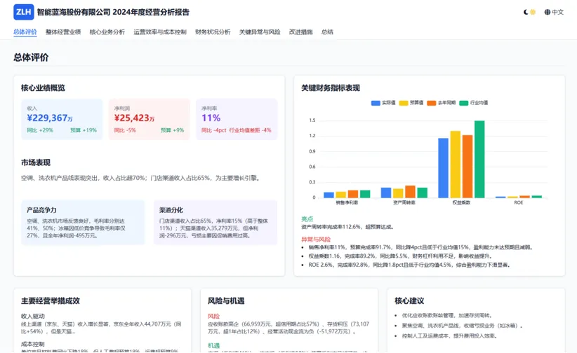 多格式输出:报告可一键导出为Word/PDF,或转化为交互式网页(含动态图表、数据溯源等),支持转发分享,能直接用于企业经营分析会议的汇报,提升会议效率与参与度。
