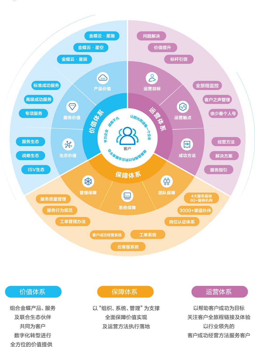 为达成客户成功目标,以金蝶哲学为指导,持续利用新技术、新架构、新模式为客户提供卓越的全旅程体验 持续为客户创造高价值服务 包括一套哲学、两大业务、三大体系、四大价值