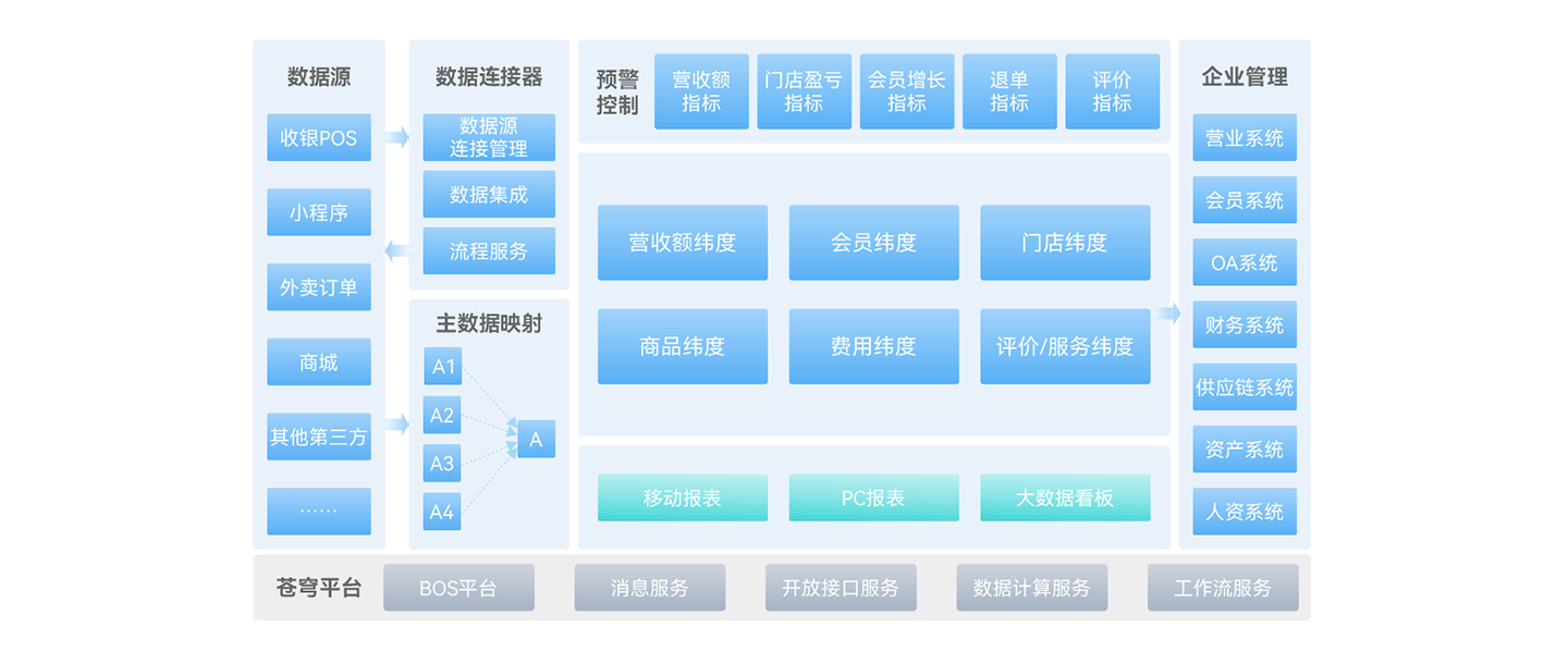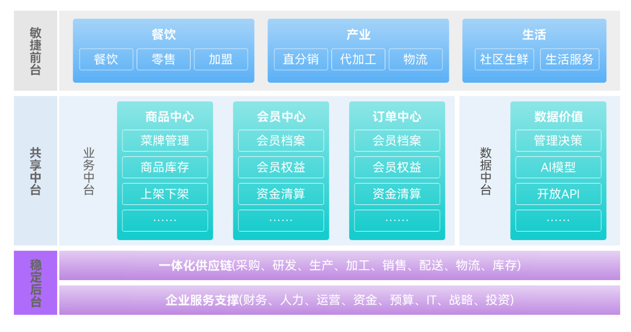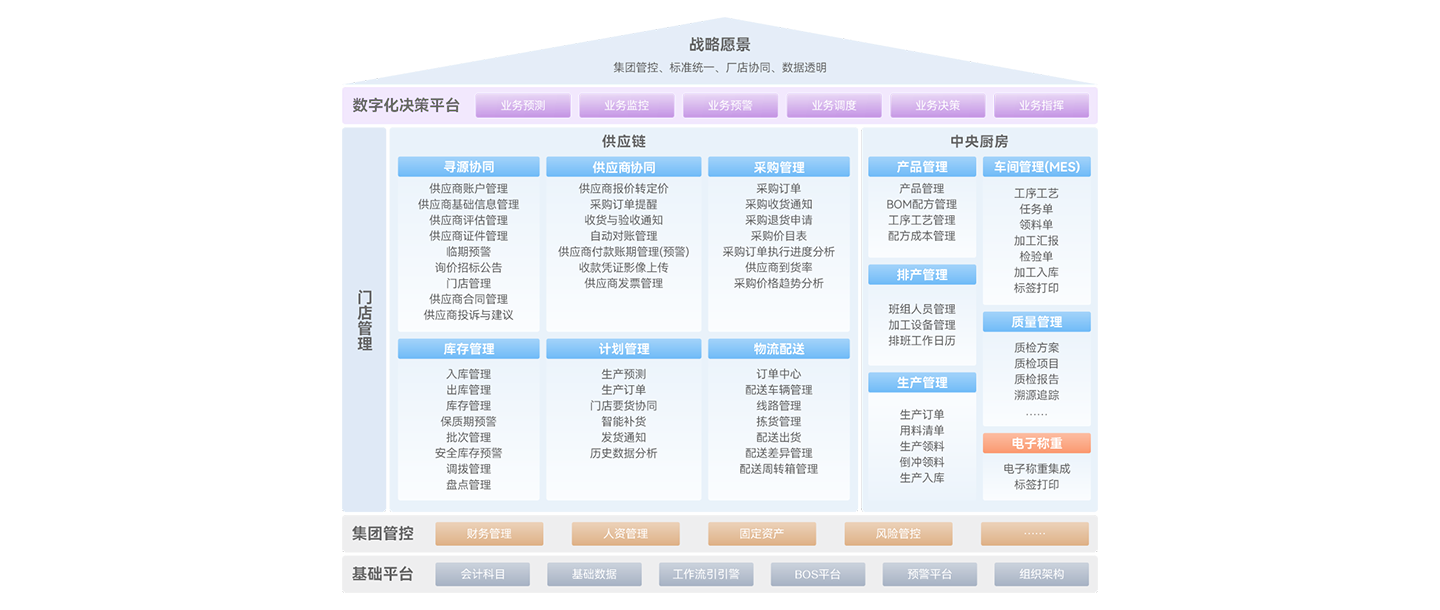 以集团为核心统一商品、物料、供应链等主数据,实现端到端的供应链、央厨、门店运营、财务业务的一体化;以集团管控平台为依托,业务流程集中管控,保障管理制度落地;通过决策分析平台实现智能分析、预警、调度
