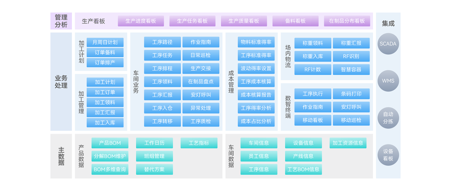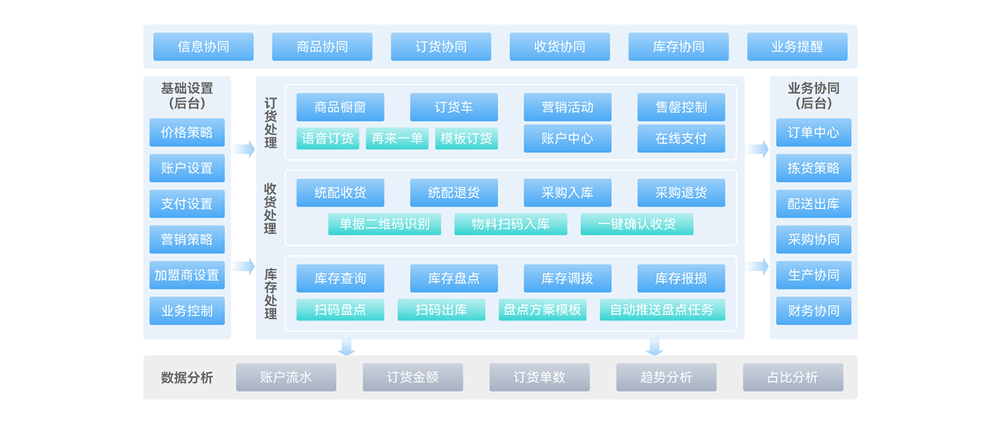OMS订单中心实现直营/加盟/B端商户等订单的归集处理;配送拣货实现按线路、仓库等全场景拣货模式,并实现跟车单自定义打印及二维码收货;生产加工支持工位屏上完成按指令进行生产领退补料和生产汇报