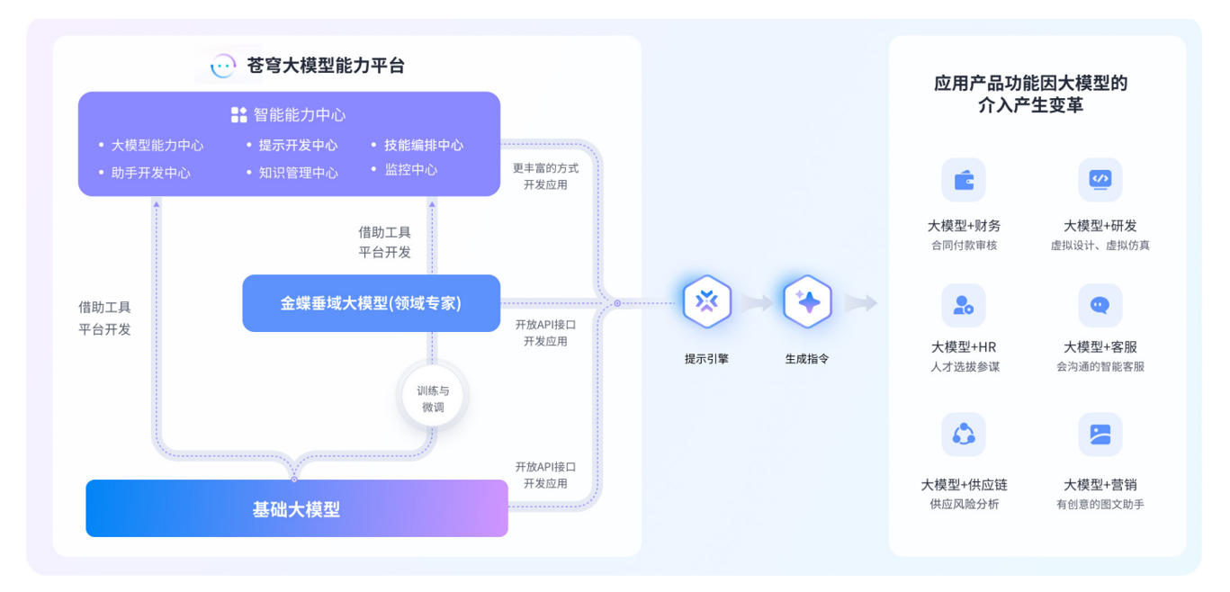 苍穹GPT以大模型能力平台为智能能力中心,可按应用场景灵活接入各种内部大模型,辅以GPT Studio开发平台工程化能力高效进行提示词开发、技能编排、搭配企业私有知识库,并通过Cosmic智能助手引擎,形成财务、HR、供应链等多业务场景的智能化变革